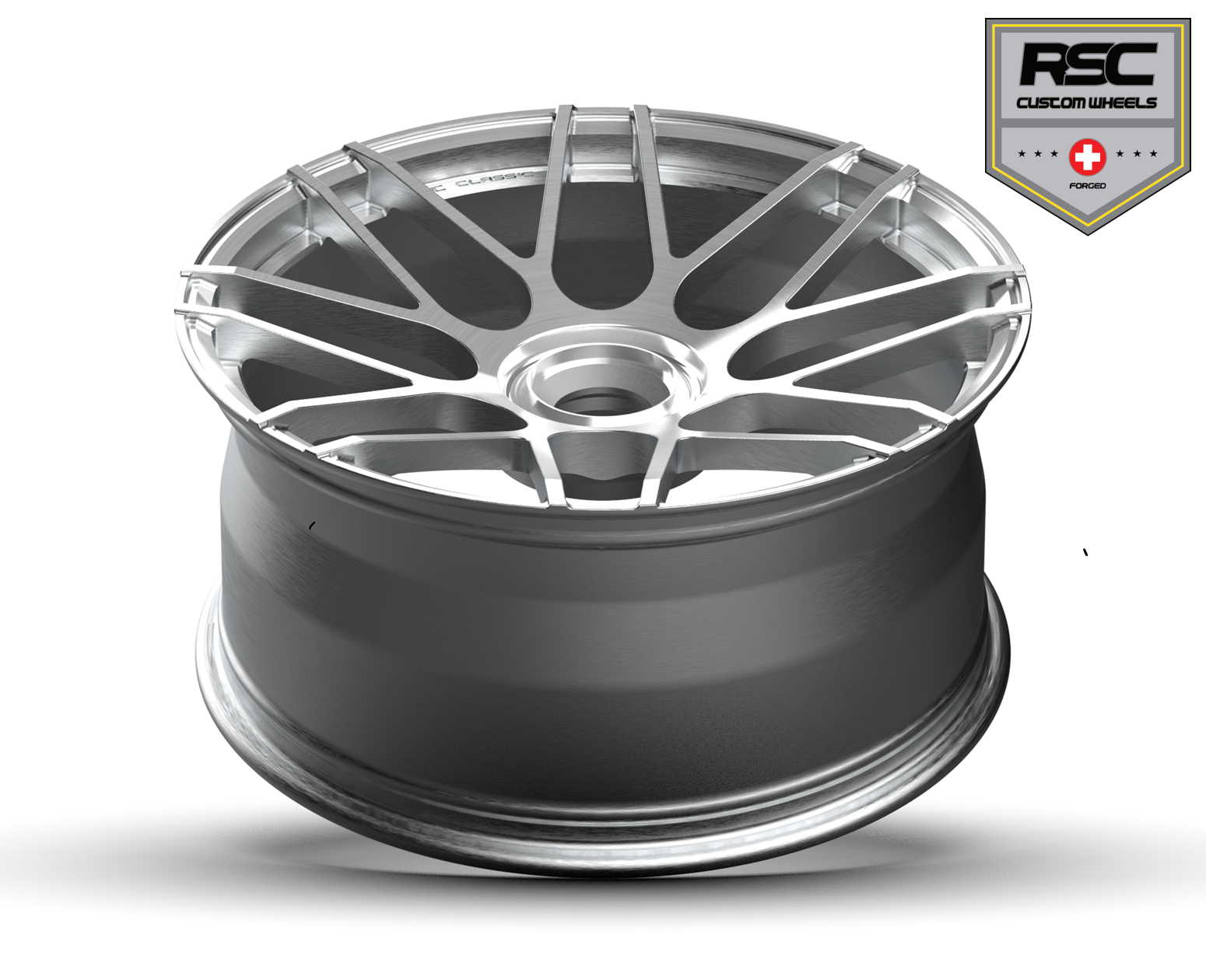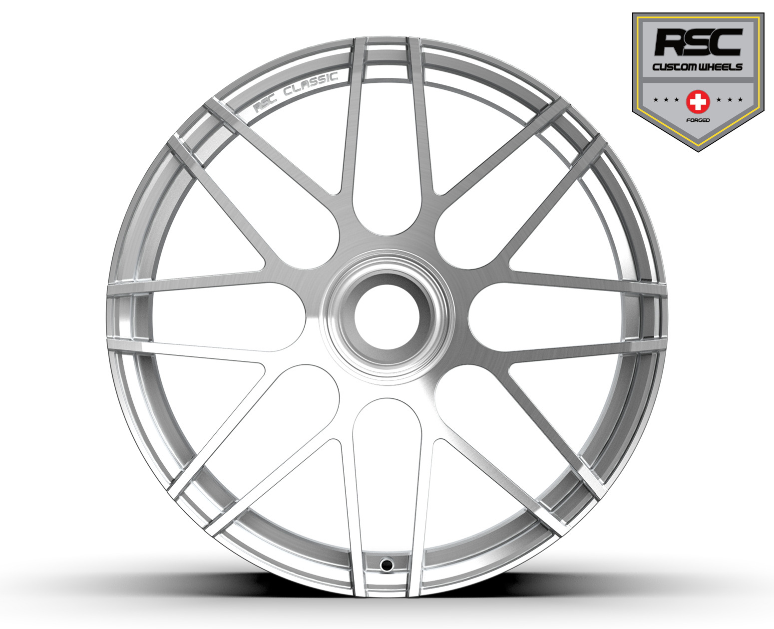 Abgebildete Ausführung: RSC Classic Cross Spoke Zentralverschluss einteilig in 10×21″ ET 20 / Oberfläche: Gebürstet & Klarlack
